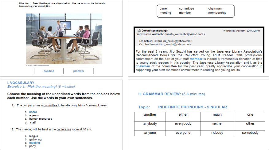 | CONTENTS | 1. Job Advertisement | 2. Recruitment | 3. Hiring | 4. Job Application | 5. Salaries and Benefits | 6. Committee Meeting | 7. Company Rules | 8. Administrative Office Procedures | 9. Labor Union | 10. Workplace | 11. Office Paraphernalia | 12. Conversation with a Superior | 13. Conversation with a Co-Worker | 14. Delegation of Duty | 15. Training and Development | 16. Making Invitation | 17. Giving Apology or Explanation | 18. Infomation Over the Phone | 19. Infomation via Email | 20. Employee’s Complaints | 21. Awards and Appreciation | 22. Scheduling Appointment | 23. Canceling or Rescheduling | 24. Teleconferencing | 25. Problem Solving | 26. Giving Opinion | 27. Asking Questions or Clarifications | 28. Expressing Idea | 29. Making a Report | 30. Presenting a Report | 31. Reciving Criticisms or Feedback | 32Closing . Business Idea | 33. Accomplishments | 34. Tardiness or Absenteeism | 35. Sick leave | 36. Work Performance Evaluation | 37. Quiting or Leaving | 38. Retairment | 39. Reservations or Accommodations | 40. Tourist Spots | 41. Dining Out | 42. Restaurant | 43. Banquets | 44. Business Lunches | 45. Meeting People | 46 Travel Guide or Map | 47 Research | 48 Product Development | 49 Cinema | 50 Theater |