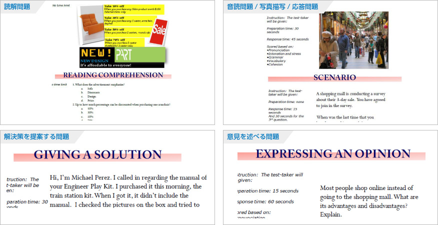 TOEIC SW:音読問題、写真描写問題、応答問題、提示された情報に基づく応答問題、意見を述べる問題